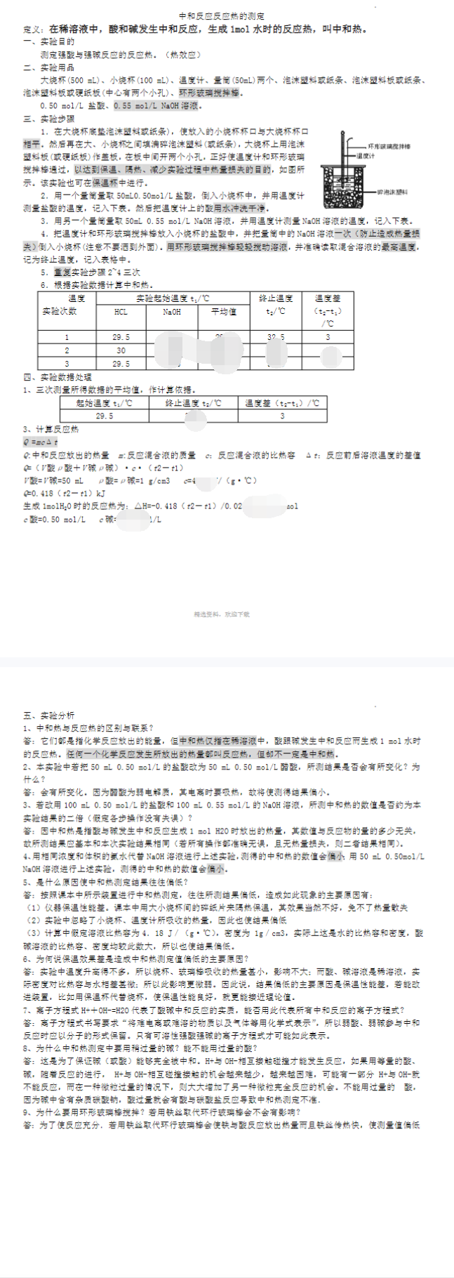 中和反应反应热的测定