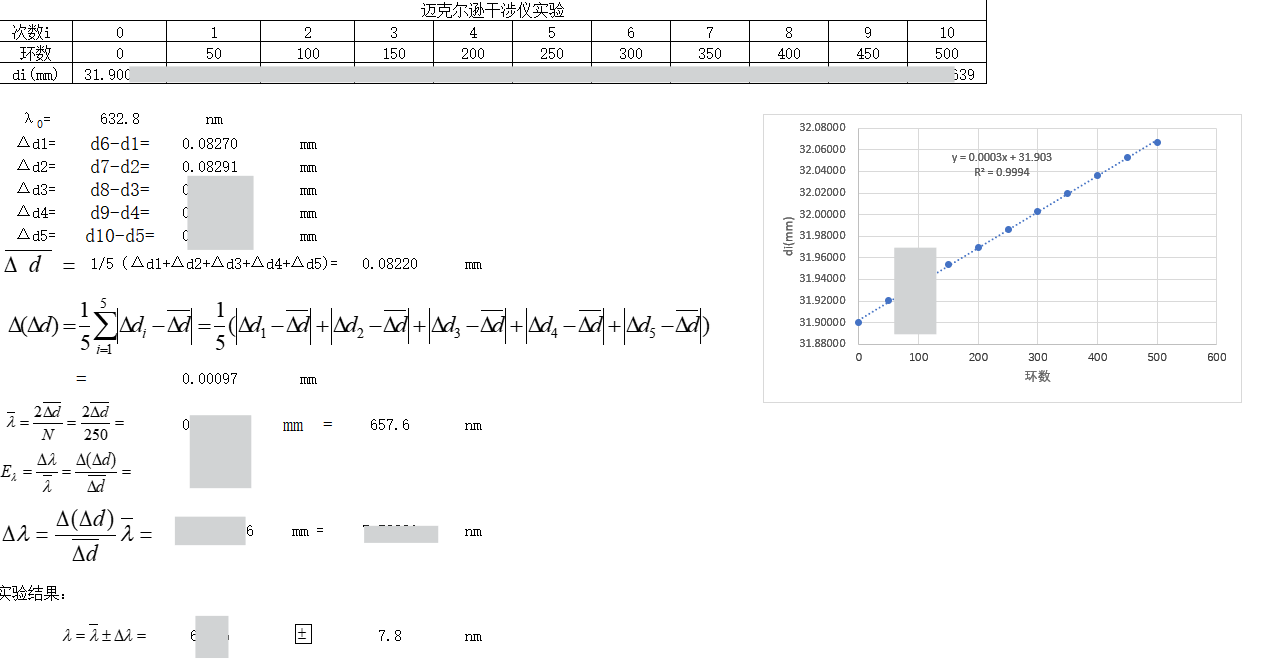 迈克尔逊干涉仪实验数据处理表格(带绘图)